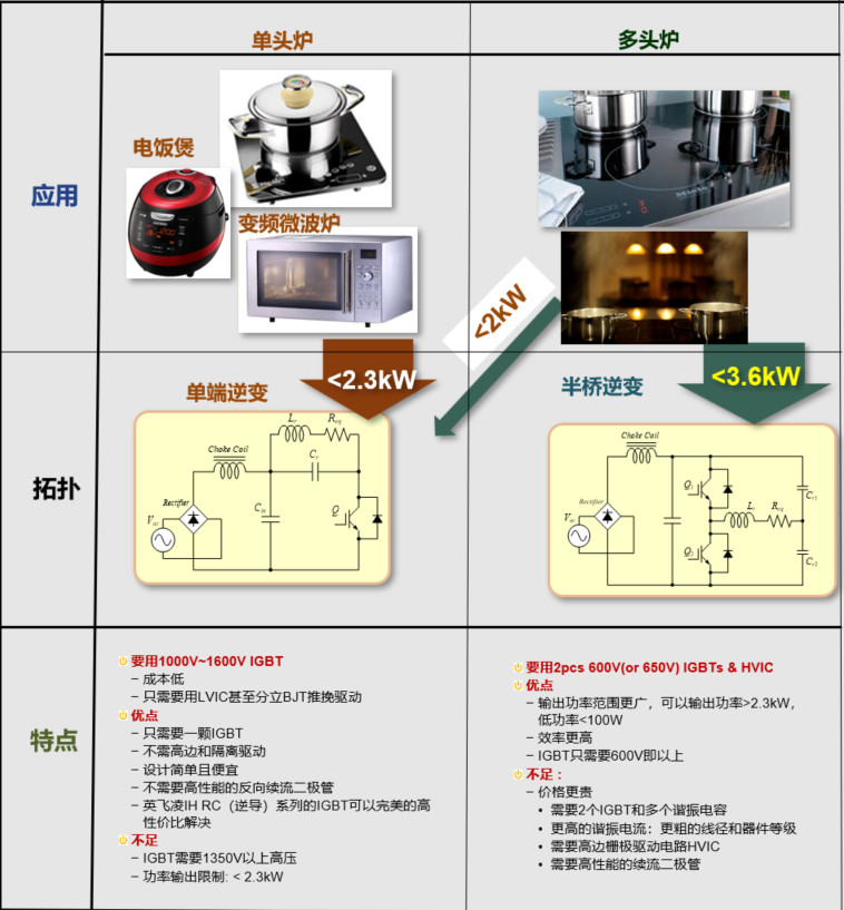 感應加熱目前主流的拓撲有單端諧振和半橋諧振兩種不同的拓撲,下圖對兩種拓撲特點做了詳細的比較:
