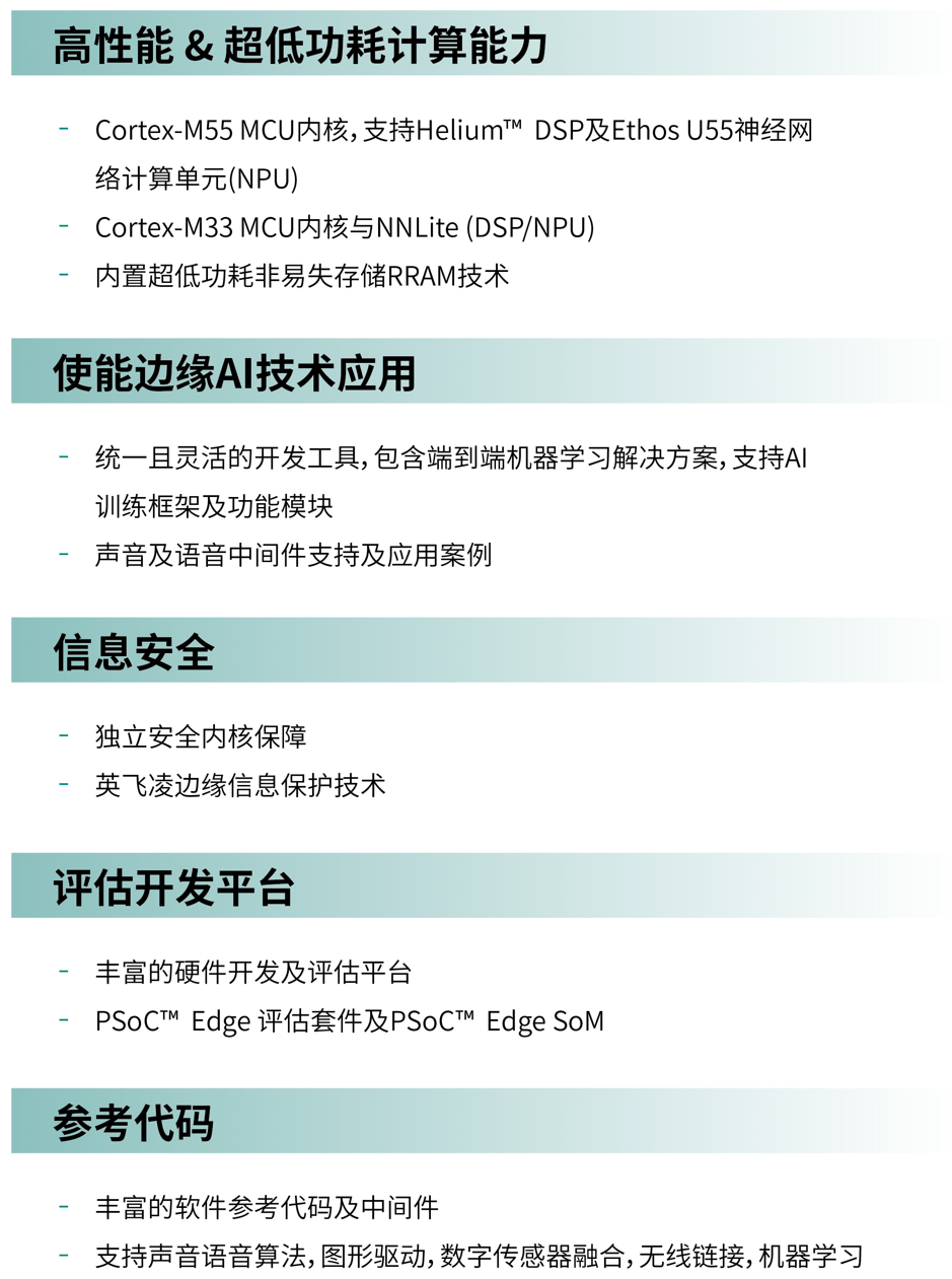 PSoC™ Edge是首款支持邊緣人工智慧的超低功耗MCU,使用戶可以通過開發嵌入式系統來打造高度實用且性能強大的硬體平台,實現對世界的人工智慧感知與控制,並支持與外界的智能交互和連接。PSoC™ Edge提供動態可調的功耗與性能模式,在滿足場景低功耗需求的同時,為新一代的應用提供新興的邊緣AI/ML需求、豐富的HMI(人機交互)功能以及信息安全功能。英飛凌還為用戶提供豐富的軟體開發工具集,端到端支持用戶項目開發,包括邊緣人工智慧開發所需的數據採集、模型推薦和訓練等。