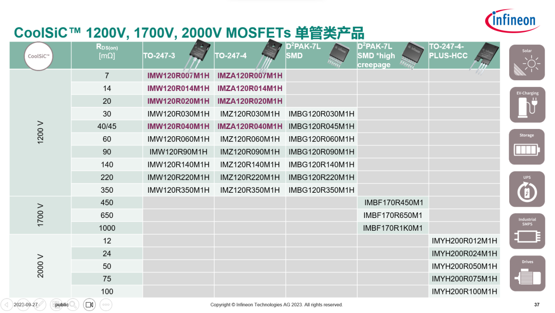 (a) 英飛凌提供完整的SiC MOSFET產品目錄,單管覆蓋650V~2000V,導通電阻從7mohm到350mohm。