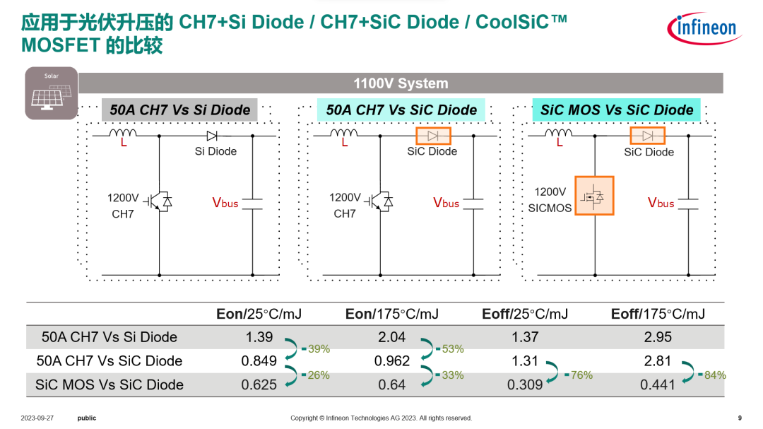 (b) 在光伏Boost中,相比於1200V 50A CH7加 Si Diode方案,1200V SiC MOSFET+SiC diode的方案,高溫下開關損耗最多可降低80%。