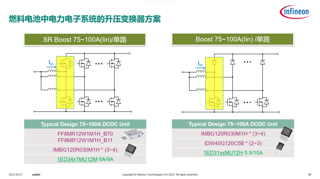 (c) 氫燃料電池是新興的應用,對能效的要求非常高。氫燃料電池車的電力電子系統主要有DCDC升壓變換器和空壓機。DCDC升壓變換器主流方案有兩種:SR boost及boost方案。兩種方案英飛凌都有完整的方案提供。