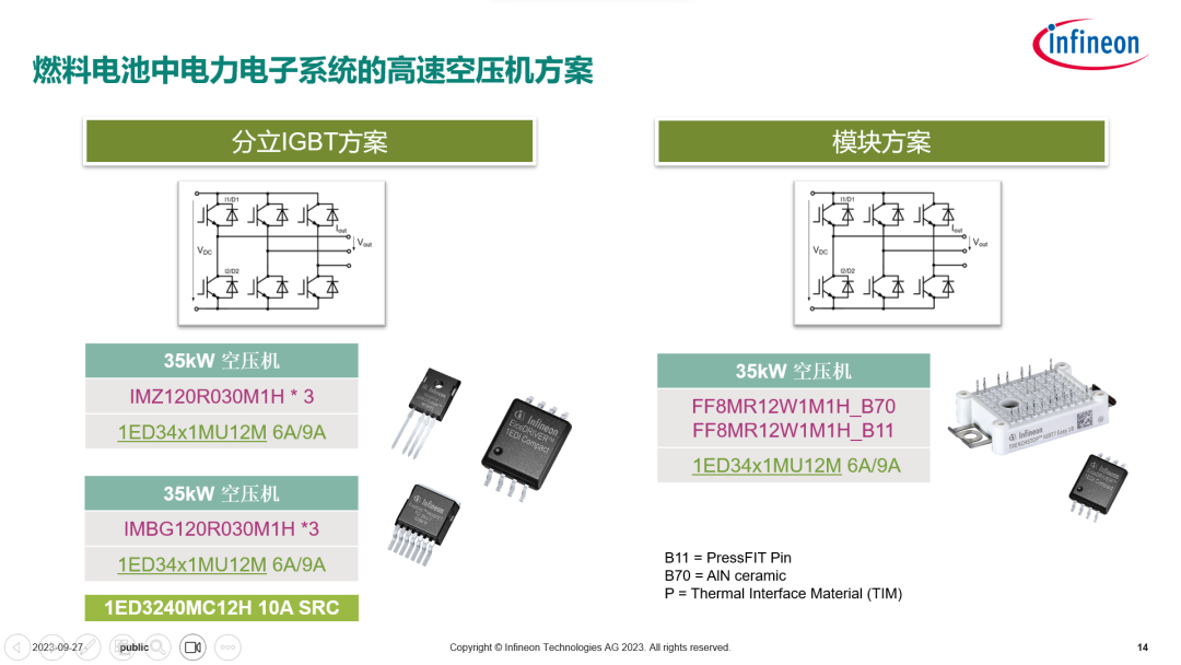 (d) 燃料電池空壓機要求高頻率、高功率、高效率,只有SiC MOSFET能滿足這些要求。針對空壓機的35kW典型功率,英飛凌有單管和模塊兩種方案提供。
