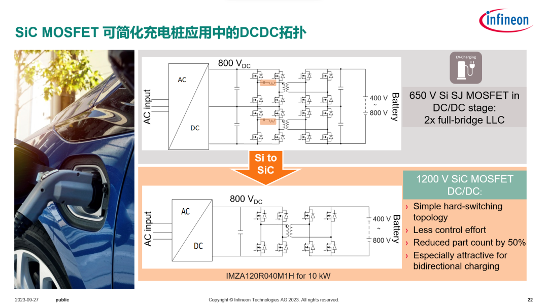 (c) SiC MOSFET可簡化充電樁應用中DCDC拓撲。傳統的充電樁使用650V Si MOSFET,兩級LLC串聯達到800V的輸出電壓。現在採用1200V SiC MOSFET可以只採用一級LLC單元,意味著整體體積可降低50%,功率密度提升一倍,並且可以實現雙向能量流動。