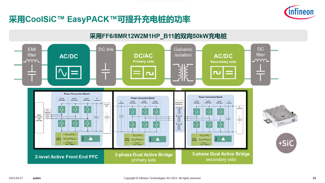 (d) 採用CoolSiC™ EasyPACK™可提升充電樁的功率。採用FF6/8MR12W2M1HP_B11可實現雙向50kW充電樁,採用三相交錯CLLC拓撲,英飛凌有相應的demo板可供參考。