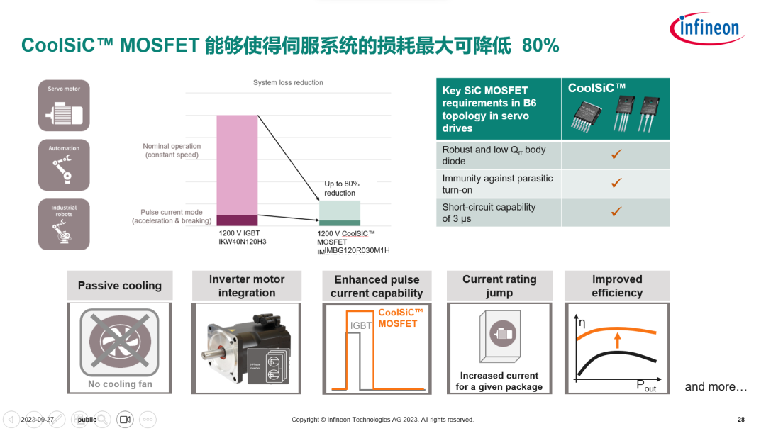 (b) SiC MOSFET應用於伺服系統中,損耗最大可降低80%。散熱方式可由主動散熱改為被動散熱,從而可以與電機集成。允許更大的脈衝電流,實現輸出功率跳檔,提升效率。
