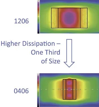圖 7:高性能寬端子薄膜電阻熱力圖對比,所需空間是常規端子的三分之一