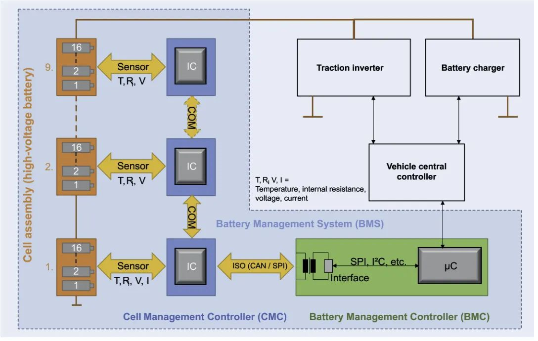 BMS 一般包括單體電池管理控制器 (CMC)、主控中央單元或電池管理控制器 (BMC) 等組件。其中,CMC 採用多通道 IC(當前最多配置 16 通道)執行監測功能,BMC 控制每個 CMC(圖1)。