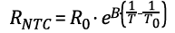 R1是一個實際的示例。4.02 kΩ的電阻確保了在溫度低於標準值時(因此NTC阻值高於標準值)仍與5V的TSENSEA腳範圍兼容。R1的上限值是VREF的全範圍(在TSENSEA可讀的最大信號),使用1 mA時可通過R1 = 5 kΩ實現。這種情況在冷場景時(NTC阻值非常高)是相關的。 R1的下限值由於在最大檢測溫度時所需的分辨率決定。 NTC阻值的一般形式方程式如下等式所示(其中R0、B和T0由NTC製造商提供)。
