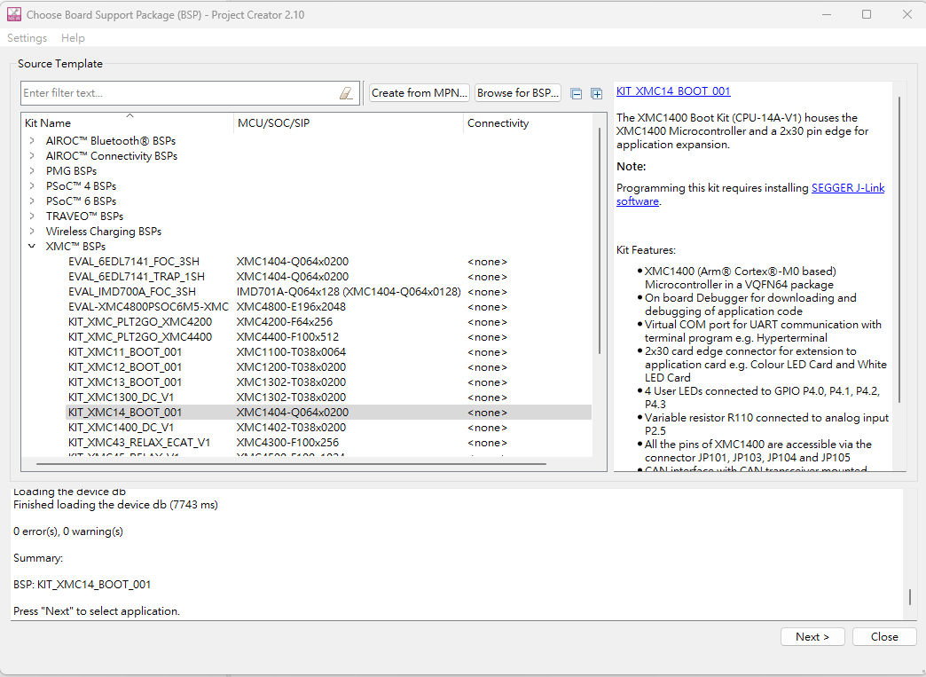 建立一個Project之前需先選擇適用的BSP,如圖所示,需要先選擇MCU 和連接裝置(如果有支援)。 當您選擇顯示的每個套件時,該套件的說明將顯示在右側。 根據在系統設定中,您可能會看到不同的類別,包括AIROC™ Bluebooth® BSPs、 PSoC™ 4、PSoC™ 6 、TRAVEO、Wireless Charging 和XMC。對於本示例,選擇KIT_XMC14_BOOT_001來演示。