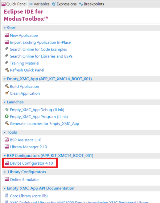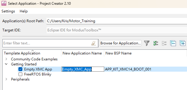 在IDE Quick Panel 中點擊 New Application,會啟動Project Creator 工具,該工具提供了多個用於不同用途的應用程式開發套件。 可用的套件可能會隨著時間的推移而變化。所有的範例檔案存在於Github上,可以直接從Infineon Github中下載相關的範列。