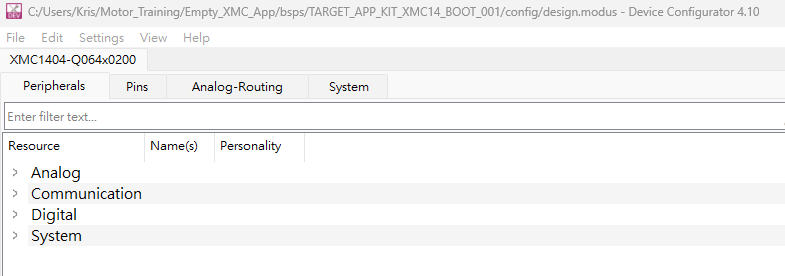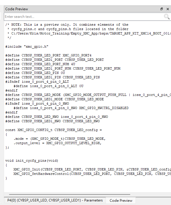 Device Configuration配置完所產生的Code皆會在此目錄底下<Project Name >/bsps/TARGET_APP_KIT_XMC14_BOOT_001/config/GeneratedSource/