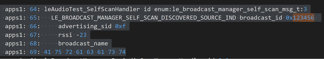 啟動掃描廣播程序,將會循環收到消息LE_BROADCAST_MANAGER_SELF_SCAN_DISCOVERED_SOURCE_IND其中會有後續所需信息broadcast_id,advertising_sid