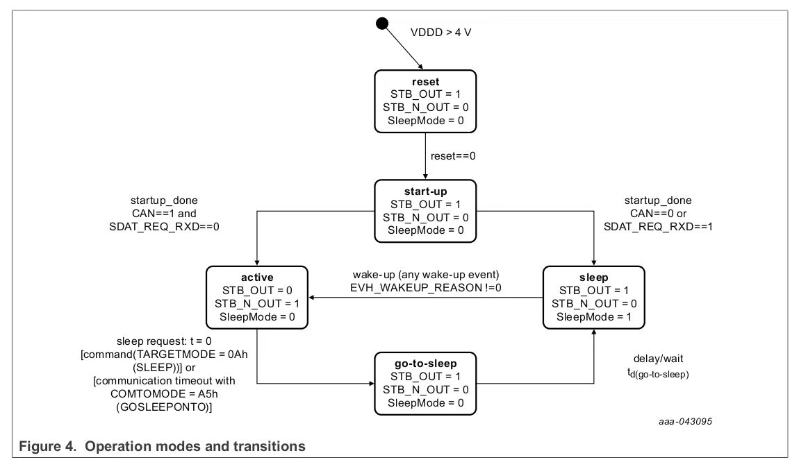 如圖 5 所示為 MC33665 操作模式和轉換,在 MCU 配置完成後,需要對 MC33665 進行復位和喚醒,步驟如下: