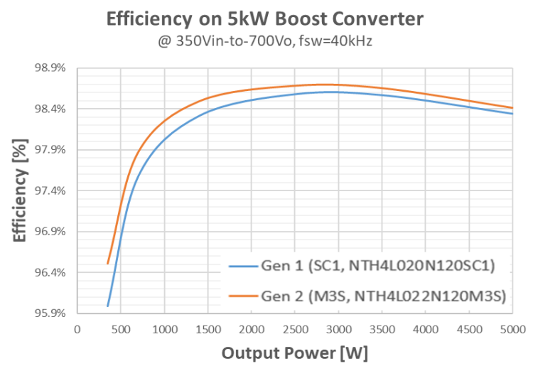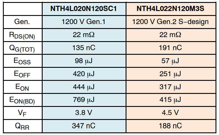 本應用筆記介紹了安森美1200V M3S碳化矽MOSFET與第一代SC1相比的主要特性,可以看出M3S取得了顯著的改進,如表3所示。圖12顯示了系統的實際性能,在40kHz開關頻率下測量的5kW升壓變換器的效率。結果明確顯示M3S比SC1表現更好,特別是在輕負載下,在該範圍內開關性能占主導地位,因此說M3S是更適合高開關頻率應用的產品。
