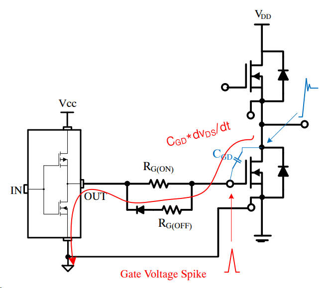 即使成功抑制,由於電橋應用中的米勒電容器,可能會因所謂的寄生導通效應而導通,如圖9 (a)所示。當上開關導通時,下開關兩端的電壓變化為dVCE/dt。電流通過寄生米勒電容CGD和外部電阻流入地。該電流可近似表示為CGD*dVCE/dt,會在路徑中的電阻器上產生壓降。如果電壓超過閾值電壓,即使在關斷後也會引發寄生導通。