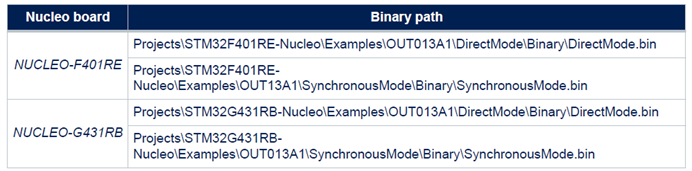 - 2.將正確的韌體 (.bin) 下載到 STM32 Nucleo 開發板微控制器上: 透過 STM32 ST-LINK 實用程式、STM32CubeProgrammer,並根據詳細資訊下表中的 STEVAL-IFP047V1 可用於以兩種不同方式控制 ISO808-1 設備。模式:直接控制模式(DCM)和同步控制模式(SCM) 提供的二進位檔案。搭配X-CUBE-IPS軟體包,使用者可透過以下方式選擇首選的控制模式選擇正確範例專案 Binary 資料夾中包含的二進位文件,如下表: