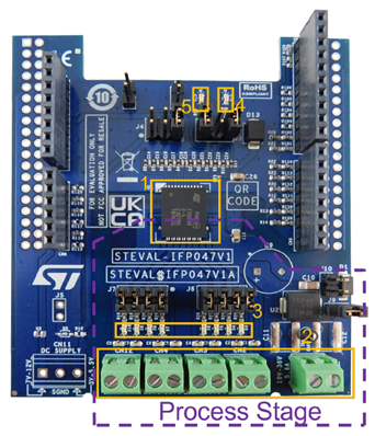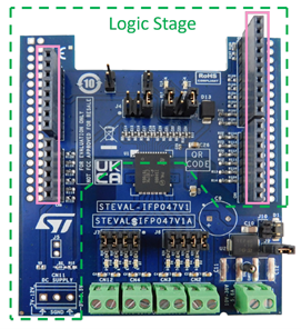 通常,STM32 Nucleo 開發板透過 USB產生的3.3 V 或 5.0 V電壓為板擴展提供電源。或者,可以從擴充板提供給STM32 Nucleo 開發板。這情況下,外部電源電壓(7-12 V)應連接到 CN11 連接器(預設未安裝)擴充板上的接地迴路應透過安裝 D2 來閉合(啟用反極性保護)或透過閉合 J5(無反極性)。在這種情況下,ISO808-1 的邏輯側可以是由擴充板產生的 3.3 V 電源軌供電:在本例中,在 STEVAL-IFP047V1 上,J4腳位 5 和 6 之間必須閉合。