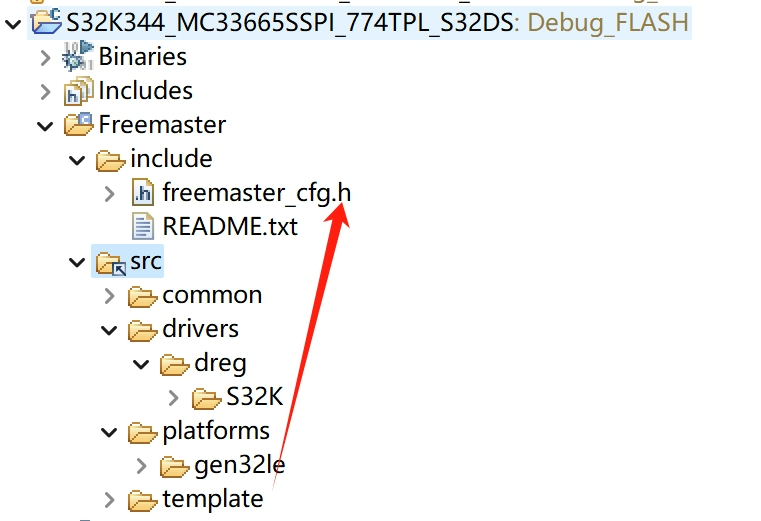 緊接著,需要便可以將 SDK 安裝完畢之後的源文件以及頭文件(位於..\S32DS.3.5\S32DS\software\FreeMASTER_S32K3_v3.0\src)鏈接到工程中,並且將 template 文件夾中的 Freemaster 配置頭文件複製到工程中。