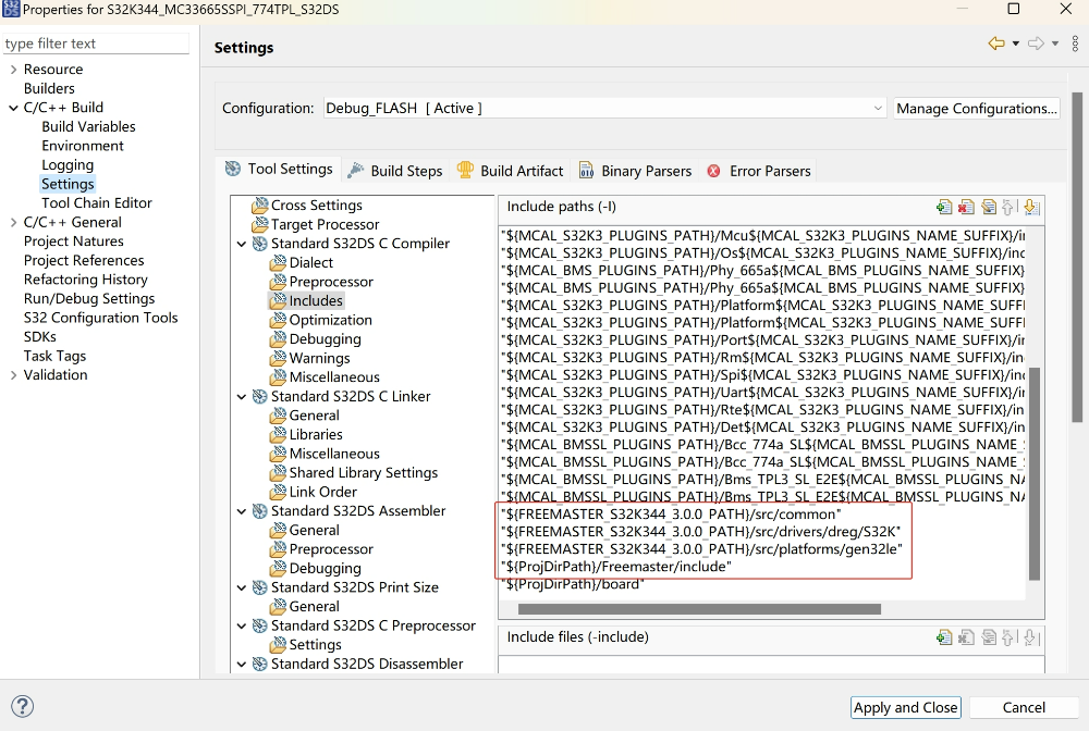 之後就是在工程屬性設置中將“src/common”、“src/drivers/dreg/S32K”、“src/platforms/gen32le”以及“freemaster_cfg.h 所在到的文件夾”全部添加進 include 路徑: