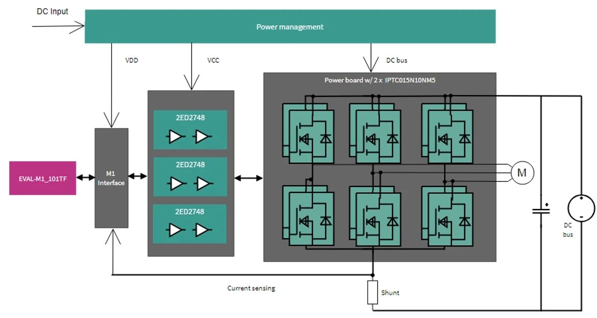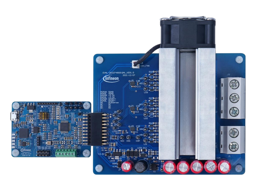用於電池供電應用(BPA)的EVAL-2ED2748S01GM1評估套件包括一塊三相逆變器功率板,該功率板帶有額定電壓為160V的2ED2748S01G(3x3 10引腳DFN封裝)半橋柵極驅動器,可驅動12個額定電壓為100V的OptiMOS™ MOSFET IPTC015N10NM5(HDSOP-16封裝)。功率板上有一個M1連接器,用於連接配有iMOTION™模塊化應用設計套件(MADK)控制卡-EVAL-M1-101T。