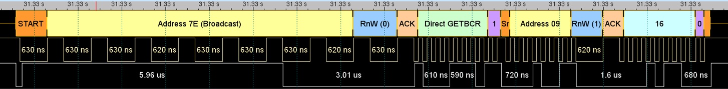 The GETBCR Direct CCC is a Get request for one I3C Target Device to return its Bus Characteristics Register (BCR) to the Controller, the BCR value is transmitted in one byte, with the MSB transmitted first.