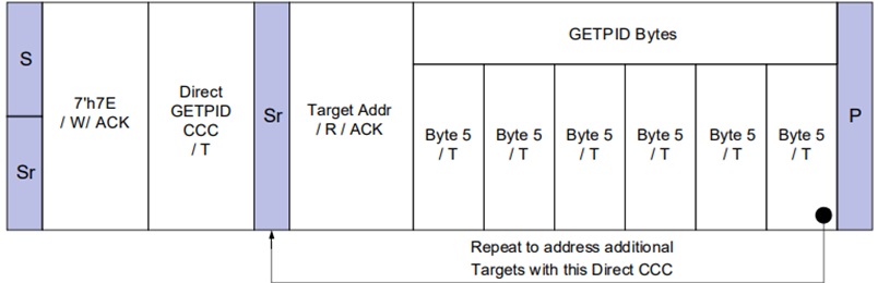 The GETPID Direct CCC is a Get request for one I3C Target Device to return its 48-bit Provisioned ID to the Controller. Following transmission of the GETPID CCC, the 48-bit value is transmitted as 6 bytes, with MSB first.