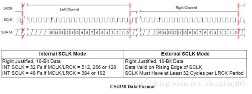 對於左/右對齊格式:LRCK為“1”表示正在傳輸的是左聲道的數據,為“0”則表示正在傳輸的是右聲道的數據;