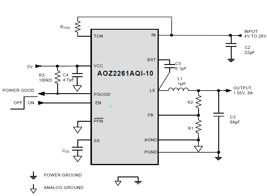 以AOS AOZ2261AQI-10來看,FB回授的電壓會與內部產生的基礎電壓(0.8V)做對比,FB低於基礎電壓(0.8V)時,內部CONTROLLER 會加快DUTY去彌補偏低的輸出電壓。直到FB回授電壓回到與基礎電壓(0.8V)相同時,回到RTON設定頻率。