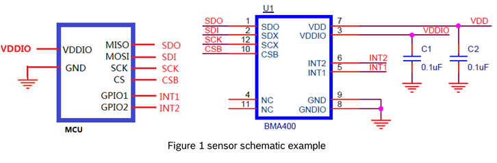 - MCU的VDDIO和BMA400應該連接到相同的電源。