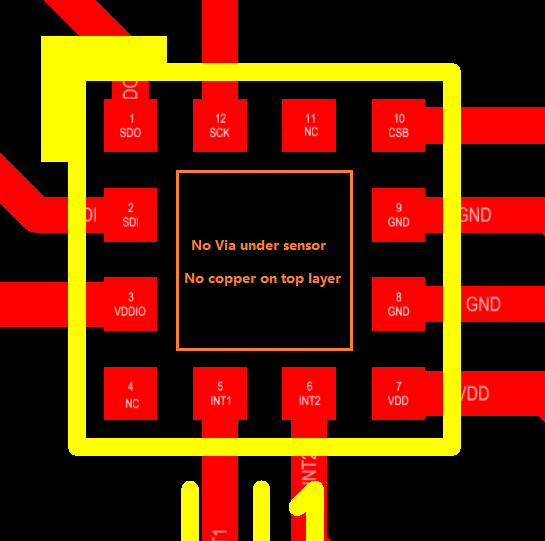 - 在頂層,傳感器安裝的位置下方無銅;而在雙層PCB的第二層(底層),歡迎使用地線銅以防止電磁干擾。