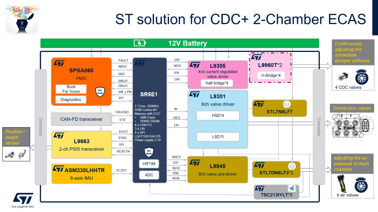 根據CDC+開式ECAS不同的系統設計需求,ST依託底盤豐富的產品,為客戶提供全套解決方案,以市面上最多的單閥CDC+雙腔ECAS為例: