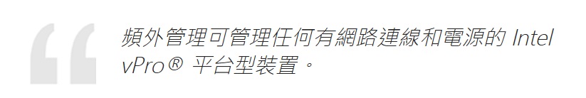 適用於 Windows 作業系統的 Intel vPro® Enterprise 可透過雲端實現頻外遠端管理。只要裝置連線至已知 Wi-Fi 網路或熱點,無論裝置位在何處,IT 管理員都能看到及管理搭載 Intel vPro® 的裝置。這有助於提高安全性、降低維護成本,並且為排解系統疑難提供了輕鬆的存取方式。