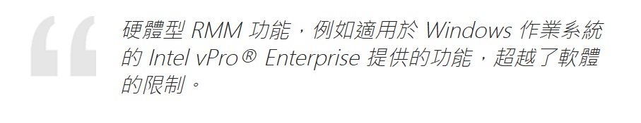 市場上有大量的遠端監測與管理(RMM)解決方案。很多屬於軟體型,可讓 IT 管理員從單一介面管理裝置。然而,這些純軟體解決方案卻因為仰賴頻內管理而受到限制。也就是說,若要管理裝置,必須先開啟電源,並且透過作用中的作業系統連線至 IT 服務才可以。