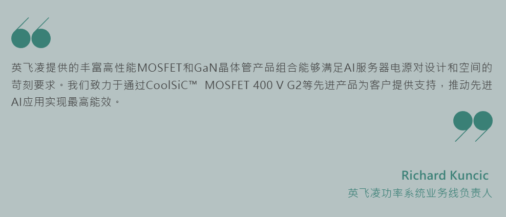 與現有的650 V SiC和Si MOSFET相比,新系列具有超低的傳導和開關損耗。這款AI服務器電源裝置的AC/DC級採用多級PFC,功率密度達到100 W/in³以上,並且效率達到99.5%,較使用650 V SiC MOSFET的解決方案提高了0.3個百分點。此外,由於在DC/DC級採用了CoolGaN™ 電晶體,其系統解決方案得以完善。通過這一高性能MOSFET與電晶體組合,該電源可提供8千瓦以上的功率,功率密度較現有解決方案提高了3倍以上。全新MOSFET產品組合共包含10款產品:5款RDS(on) 級(11至45 mΩ)產品採用開爾文源TOLL和 D²PAK-7 封裝以及.XT 封裝互連技術。在Tvj = 25°C 時,其漏極-源極擊穿電壓為400 V,因此非常適合用於2級和3級轉換器以及同步整流。這些元件在苛刻的開關條件下具有很高的穩健性,並且通過了100%的雪崩測試。高度穩健的CoolSiC™ 技術與.XT互連技術相結合,使這些半導體器件能夠應對AI處理器功率要求突變所造成的功率峰值和瞬態,並且憑藉連接技術和低正 RDS(on) 溫度係數,即便在結溫較高的工作條件下也能發揮出色的性能。