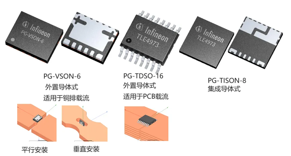 外置導體的優勢是待測電流不流經晶片本體,因此不會在晶片內造成熱累積,所以可測電流範圍可以達到2KA以上,相較於使用磁芯進行聚磁的電流傳感器模塊來說,這種方案在成本和體積上都更有優勢,目前正受到越來越多的用戶青睞。TLE4973- xE35主要採用PG-VSON-6和PG-TDSO-16兩種封裝。PG-VSON-6因為體積較小,更適合於銅排載流的場合,PG-TDSO-16則推薦應用於PCB載流。