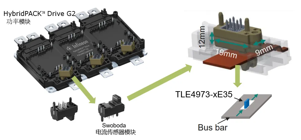 該模塊使用了英飛凌的下一代晶片技術 EDT3(SI IGBT)和 CoolSiC™ G2 MOSFET ,實現在 750 V 和1200 V 電壓等級內達到 300 kW 的功率。其PIN腳的銅排在結構上進行了優化,可方便地嵌入內置TLE4973-xE35晶片的Swoboda電流傳感器模塊,覆蓋從500A -2500A 量程的所有測量需求。用戶僅需要對該模塊進行配置後即可使用,無需進行結構設計和仿真。