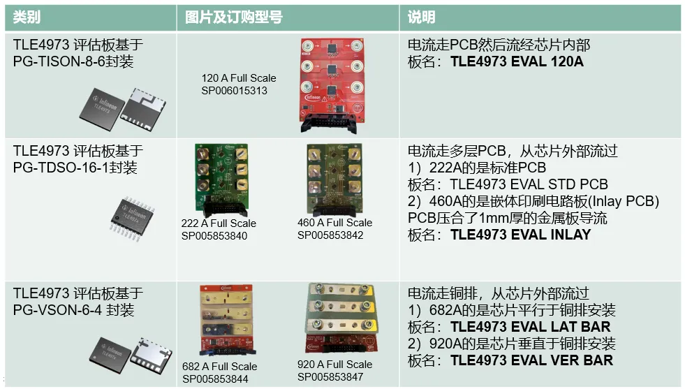 TLE4973根據不同封裝目前可以提供5款評估板,具體介紹如下表: