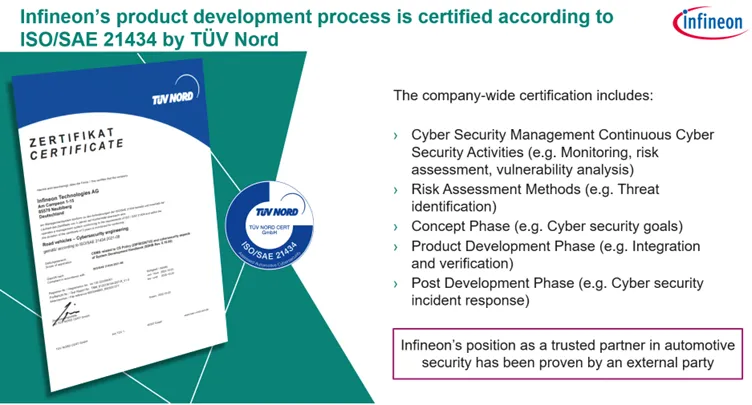 下圖是英飛凌針滿足ISO/SAE 21434的認證證書。