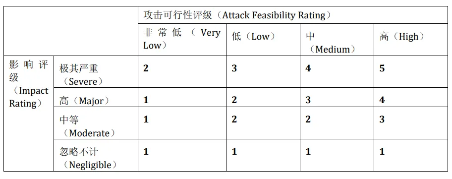 攻擊可行性評級的方法有多種,比如基於攻擊潛力(Attack Potential-Based Approach)、基於CVSS、基於攻擊向量(Attack Vector Based)等。ISO/SAE 21434中指出可以基於這三種方法中的任何一種進行攻擊可行性評級,可分為非常低(Very Low)、低(Low)、中(Medium)、高(High)四個級別。