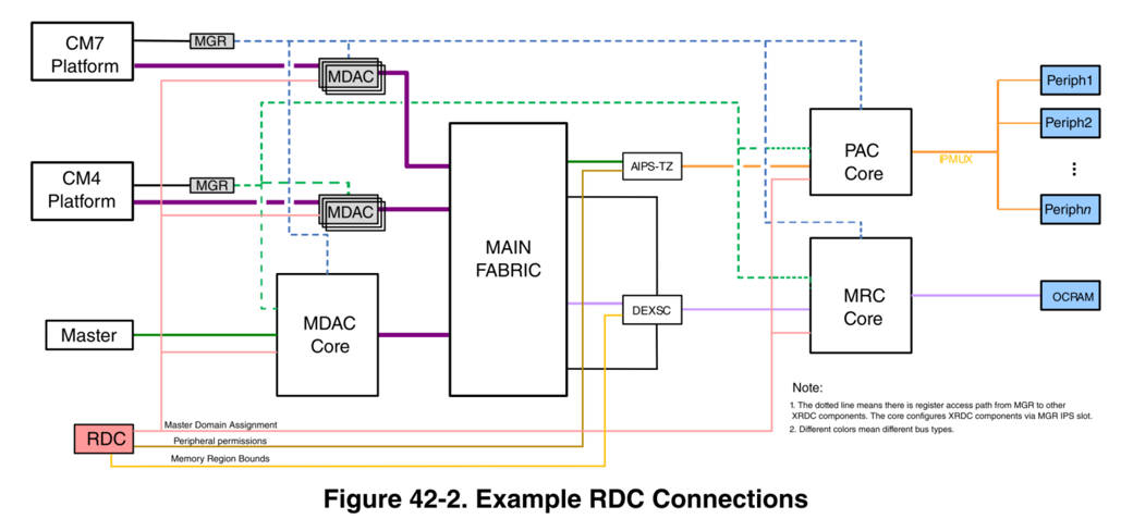 當 CM7 核心發起對 Periph1(例如 GPIO)的使用時,RDC(Resource Domain Controller)會通過多個子模組(如 Main Fabric、MDAC、MRC 等)進行管理和控制,以確保資源的安全和可靠使用。