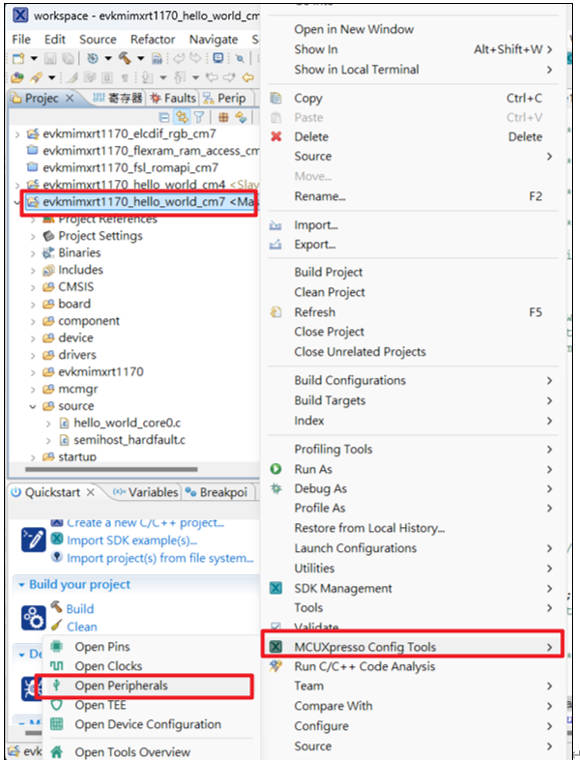 2. 開啟 M7 專案,在資料點擊右鍵,選擇 MCUXpresso Config Tools à Open Peripheral