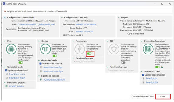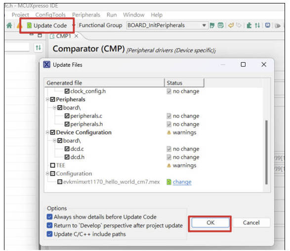 6. 在 MCUXpresso Config Tool 點選 Update Code 會提示更新的檔案,確認無誤後點選 OK,在專案中的 driver 可看到新增