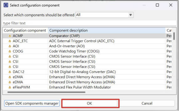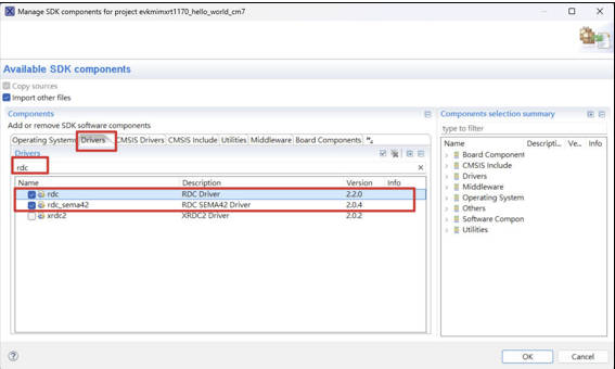 5. 在 Drivers 分頁下搜尋 RDC,勾選 rdc 及 rdc_sema42 後點選 OK 後跳出 SDC Component Management 視窗確認無誤後點選 Yes,確認無誤後在 select which components 點選 OK。