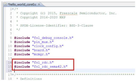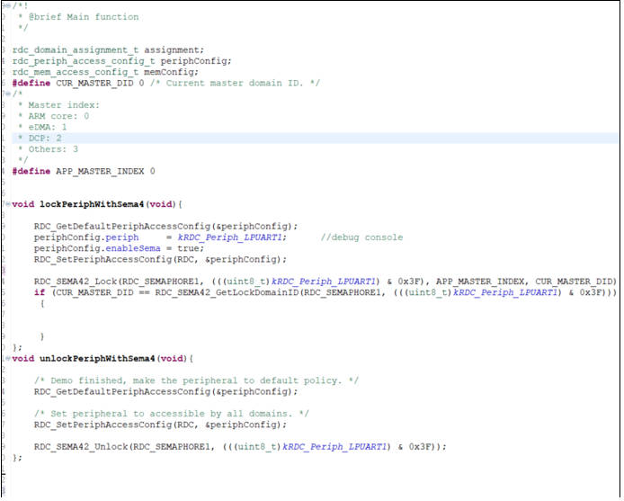 RDC_GetDefaultPeriphAccessConfig(&periphConfig); periphConfig.periph = kRDC_Periph_LPUART1; //debug console periphConfig.enableSema = true; RDC_SetPeriphAccessConfig(RDC, &periphConfig);