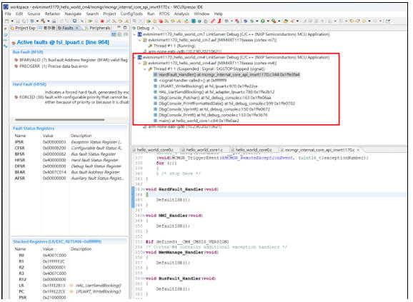 12. 燒錄到板子並使用 terminal 執行後確認,在 debug 模式下可看到 M4 進入 HardFault_Handler