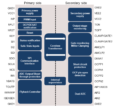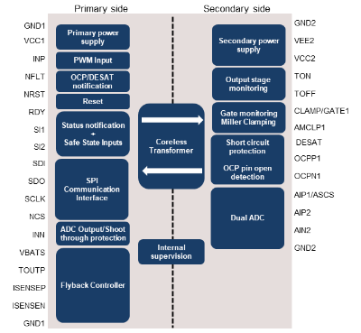 自2009年第一代汽車級高壓EiceDRIVER™發布以來,用於主驅的驅動IC產品經過優化改進已經發展到第三代集成SPI功能的305x系列,可以靈活配置參數,優化驅動性能,能兼容用於驅動600V/750V/1200V IGBT和SiC MOSFET功率器件。無核變壓器CT技術仍是其實現原副安全隔離功能、傳輸信號和數據的主要手段,滿足IEC60747和UL1577中的8kV基本絕緣要求和6kV增強絕緣,能實現dv/dt>150V/ns共模電壓暫態CMTI信號突變能力,抗干擾能力強,同時,按照ISO26262要求能滿足安規ASCII B或D要求,可以實現主驅系統功能安全需求。