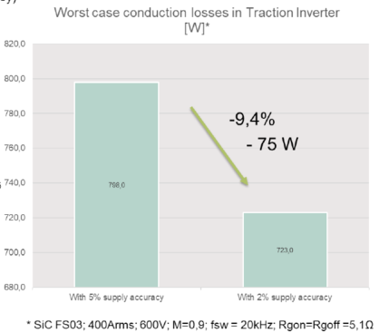 反饋的電壓精度可以實現2%以內控制,尤其對於驅動SiC器件而言,由於Rdson受驅動電壓影響比較大,會改變導通損耗大小,進而影響器件發熱。舉一個例子,相比5%的精度而言,按照Vgs=15V對應的Rdson=5.8mohm,最嚴酷情況看Vgs=13.9V,此時對應的Rdson=6.5mohm,但2%精度Vgs=14.7V對應的為Rdson=5.9mohm,因此,粗略仿真評估後由於電源精度引起的導通損耗差異達到9.4%左右,如圖4所示。
