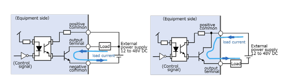 接下來我們將介紹TOSHIBA photorelay在電晶體輸出端的應用範例, photorelay主要用於解決機械繼電器問題,但近年來, photorelay也已被應用以消除電晶體和MOSFET的缺點.由於電晶體和MOSFET輸出用於向弱電設備輸出訊號範圍為 12 至 48 VDC.電源和負載的連接方式有兩種: 第一種為電流流動的類型,當輸出電晶體導通時,第二種為從負載到輸出端,Source電流從輸出端流向負載,可參考圖2-1和2-2.