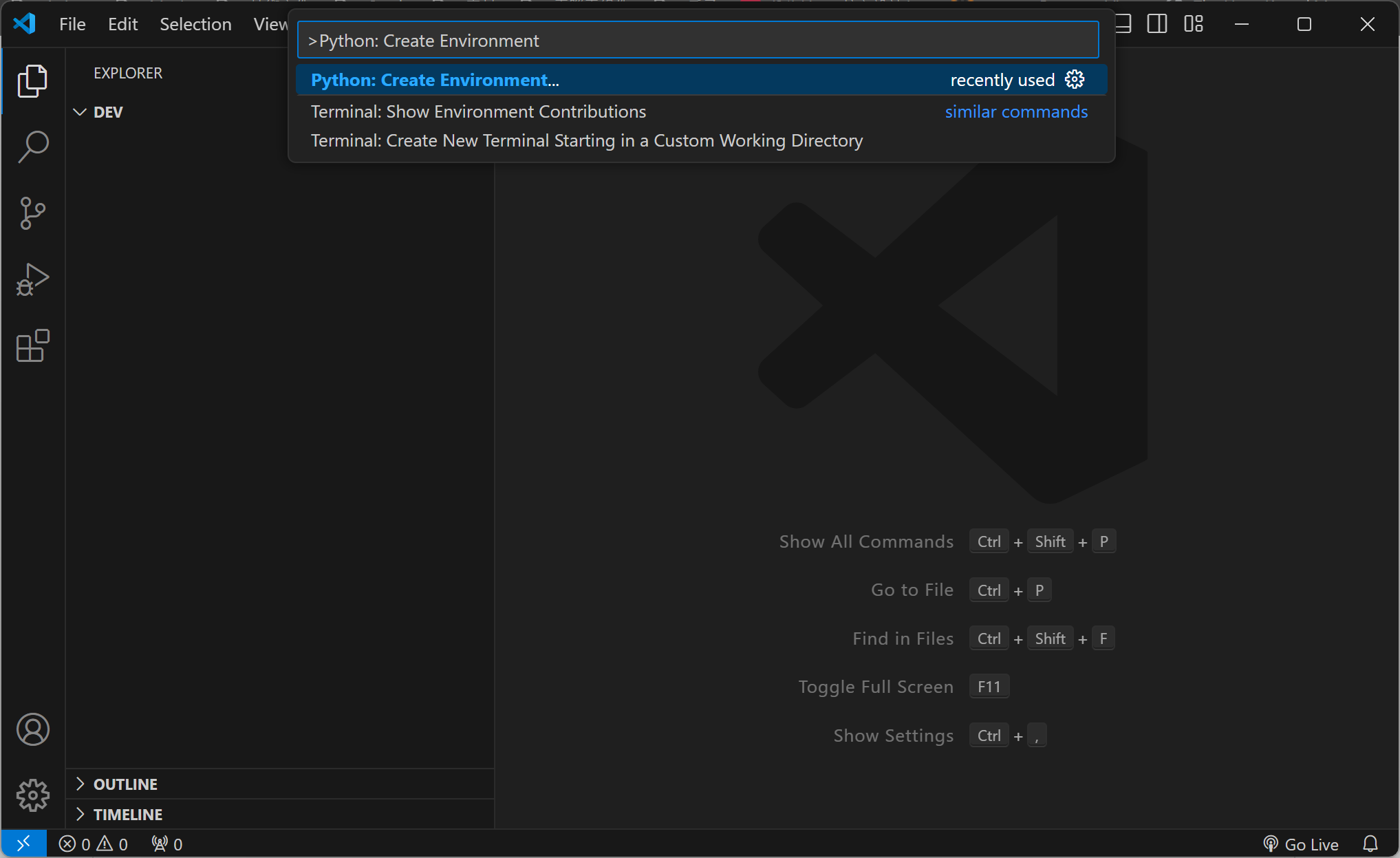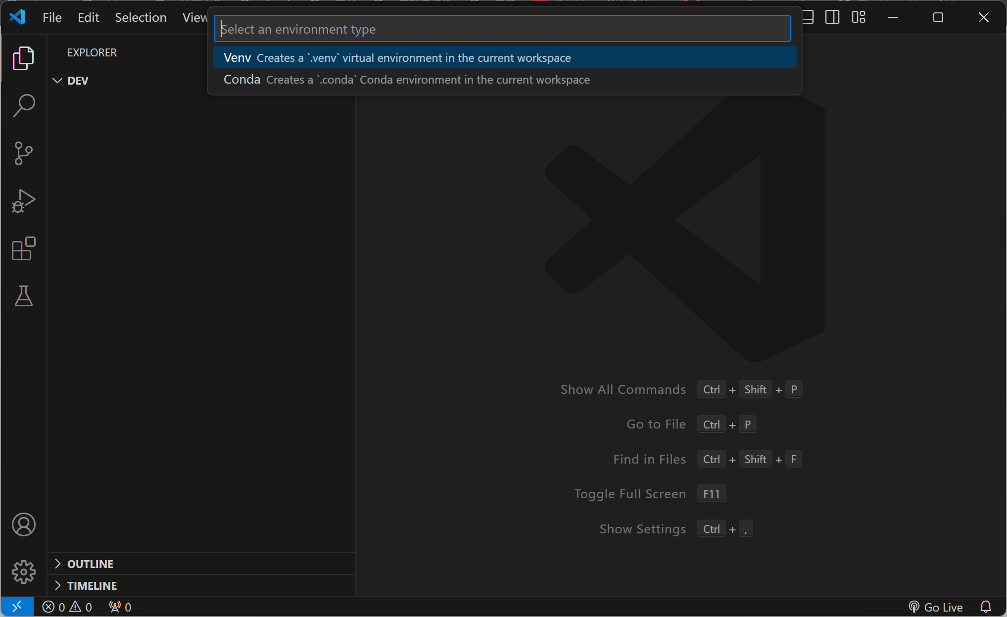 Ctrl + Shift + P,輸入Python: Create Environment( 請先安裝 VS Code Python 套件 )