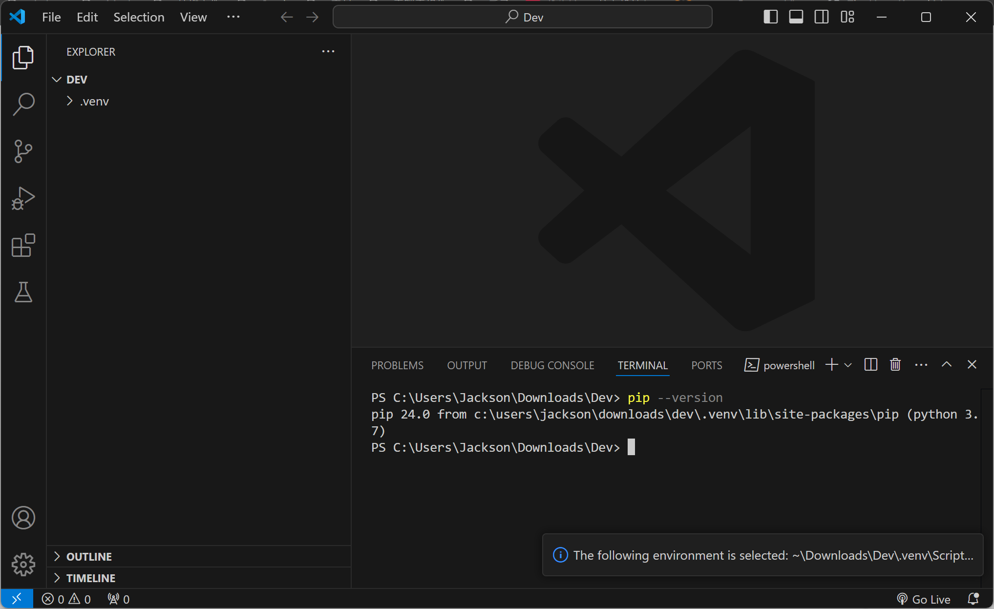 Ctrl + Shift + `開啟終端機,輸入pip --version檢查是否在.venv下